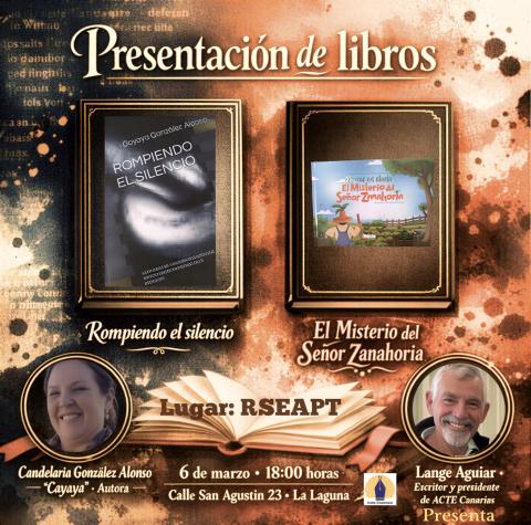 Acompáñanos el próximo 6 de marzo a las 18:00 horas en la RSEAPT (Calle San Agustín 23, La Laguna) para la presentación de los libros Rompiendo el silencio de Candelaria González Alonso "Cayaya" y El Misterio del Señor Zanahoria, en un acto presentado por Lange Aguiar.
