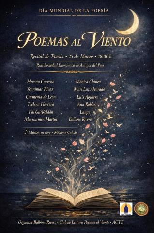 El próximo 25 de marzo a las 18:00 h, la Real Sociedad Económica de Amigos del País acogerá el recital "Poemas al Viento" en conmemoración del Día Mundial de la Poesía; un evento organizado por Balbina Rivero, el Club de Lectura Poemas al Viento y ACTE que contará con diversas voces poéticas y la música en vivo de Máximo Galván.