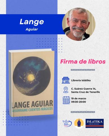 El autor Lange Aguiar visitará la Librería Islátika (C. Suárez Guerra 14, Santa Cruz de Tenerife) el próximo 19 de marzo para una jornada de firma de libros de su obra "Susúrrame cuentos mágicos", en un horario de 09:30 a 20:00 h. No pierdas la oportunidad de conocer al escritor en persona y llevarte tu ejemplar dedicado en un ambiente literario único en el corazón de la ciudad.