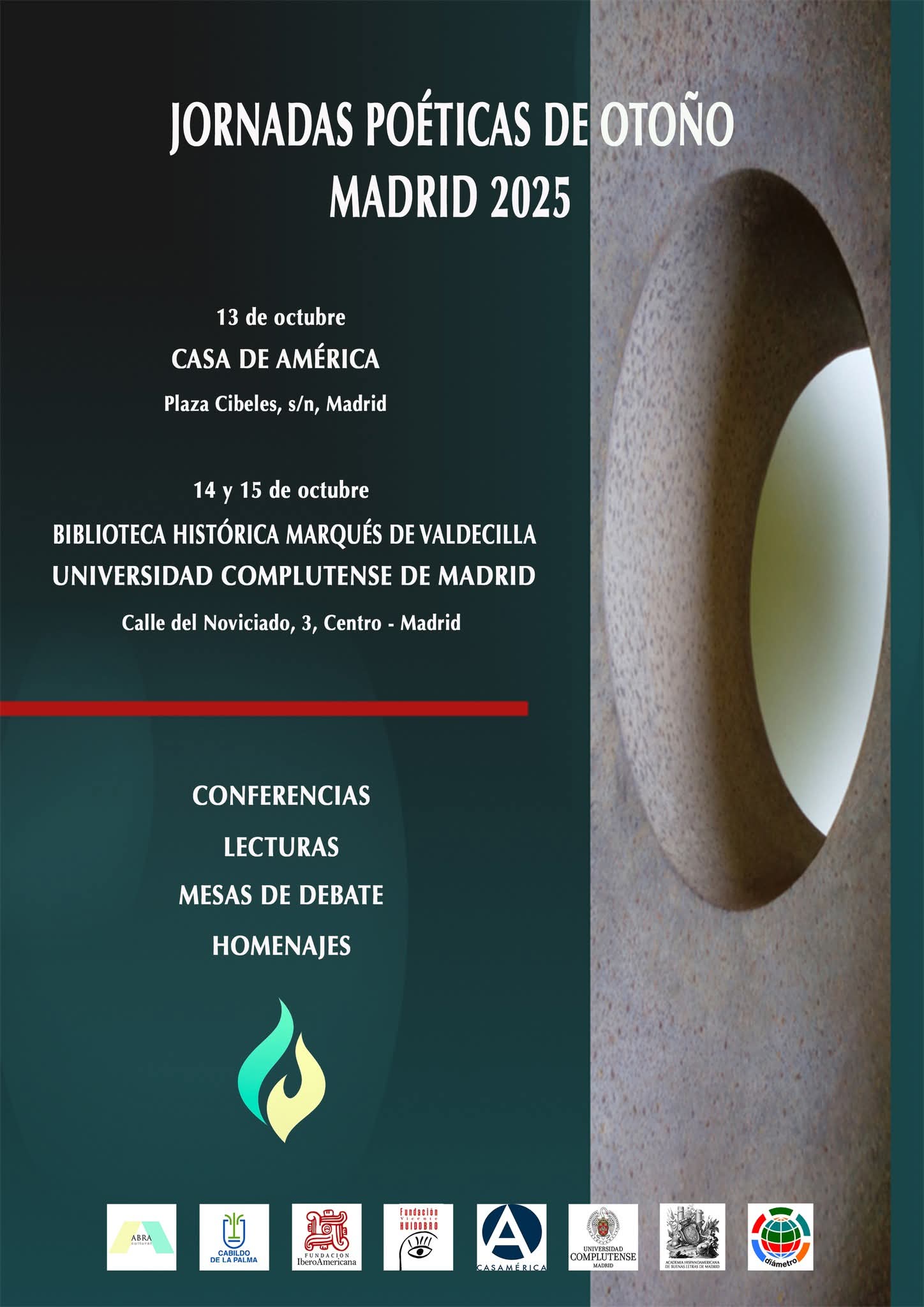 Por la información que hemos recibido, estas JORNADAS POÉTICAS DE OTOÑO integran una serie de actividades como conferencias, lecturas, mesas de debate y homenajes, el día 13 de octubre en Cada de América (Plaza Cibeles) y los días 14 y 15 de octubre en la Biblioteca Histórica Marqués de Valdecilla (Universidad Complutense).
