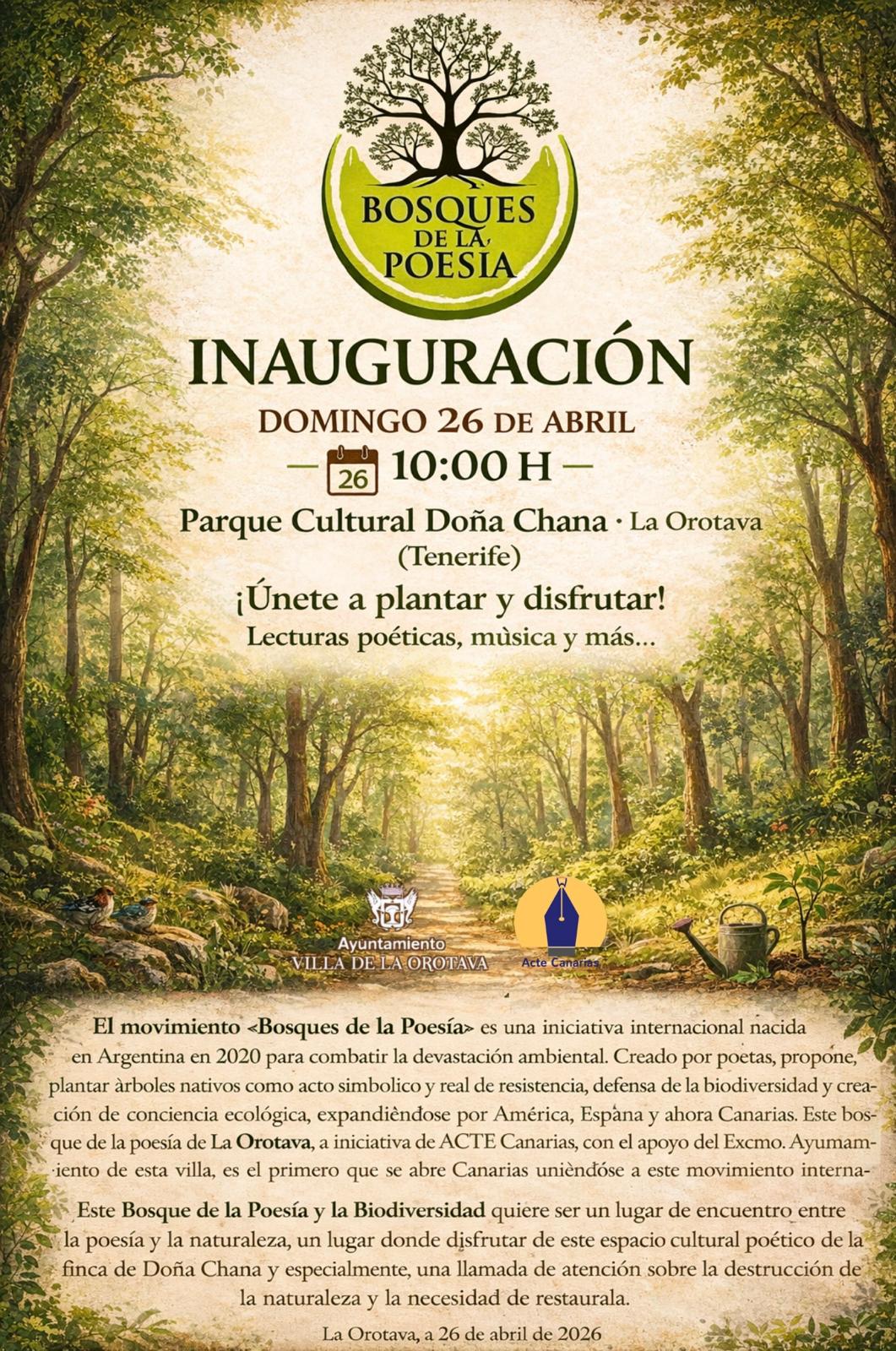 Bienvenidos a este primer Bosque de la Poesía de las Islas Canarias. Que esta selva de palabras crezca fuerte, que sus hojas reciten al viento y que sus raíces mantengan siempre unida nuestra voz a la de la madre tierra.