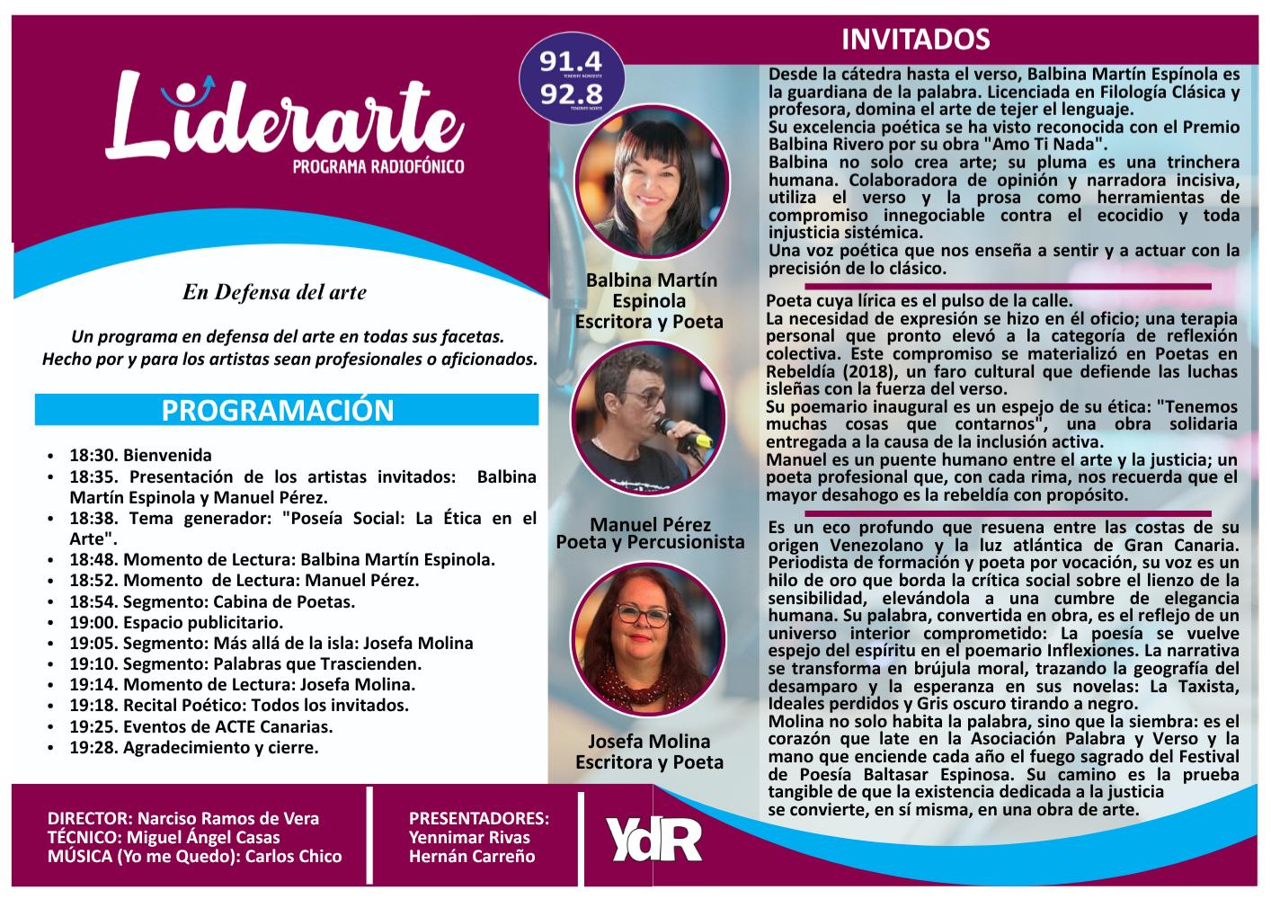 LIDERARTE… con Hernán Carreño y Yennimar Rivas recibió el 21 de octubre la visita de los poetas Manuel Pérez, de Poetas en Rebeldía, y de Balbina Martín, ganadora del Premio Balbina Rivero 2025.