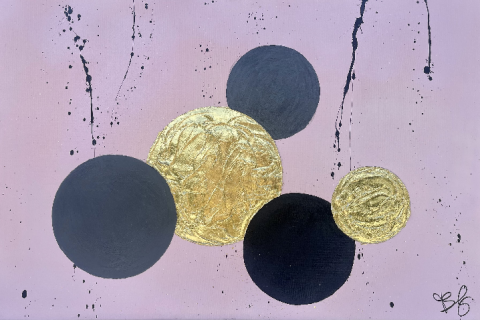 La pintura es su faceta más personal. Con ella la artista se expresa a través de la técnica mixta donde predomina la pintura abstracta y las siluetas metálicas, una danza de color y brillo en acrílico sobre lienzo y pan de oro y plata que se entrelazan para lograr una experiencia visual única. El pouring también está presente en esta forma de expresión vanguardista, otra técnica que utiliza en muchas de sus obras para darle dinamismo al lienzo.