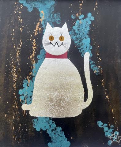 Entre las siluetas más destacadas y que forman parte del sello identitario de la artista encontramos la figura del gato, asociado al misticismo y con el que expresa su independencia y libertad.