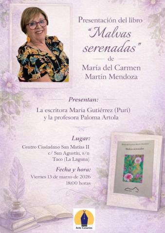 Acompaña a la escritora y poeta María del Carmen Martín Mendoza en la presentación de su obra "Malvas serenadas" , en un acto donde participarán la escritora María Gutiérrez (Puri) y la profesora Paloma Artola. La cita es en el Centro Ciudadano San Matías II (Taco, La Laguna) el próximo viernes 13 de marzo a las 18:00 horas.