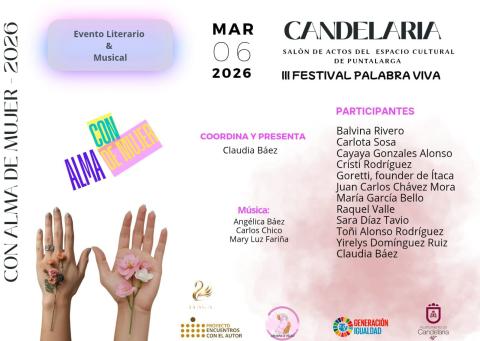 El III Festival Palabra Viva: Con Alma de Mujer se celebrará este 6 de marzo en el Salón de Actos de Puntalarga, Candelaria, uniendo la voz de destacados autores con la música en vivo de Angélica Báez, Carlos Chico y Mary Luz Fariña bajo la coordinación de Claudia Báez.