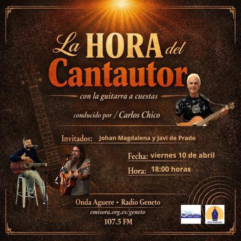 Acompáñanos en "La Hora del Cantautor con la guitarra a cuestas", un programa especial conducido por Carlos Chico. Este Viernes 10 de abril a las 18:00h con los invitados: Johan Magdalena y Javi de Prado por Onda Aguere - Radio Geneto (107.5 FM).