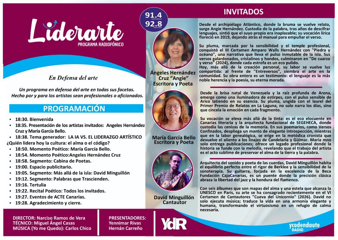 Gran inicio de temporada en Liderarte! Arrancamos este 03 de Febrero del 2026 con el programa "En Defensa del Arte", donde tuvimos el honor de contar con una mesa de lujo. Nos acompañaron las escritoras Angi Hernández Cruz y María García Bello, junto al talento del cantautor David Minguillón vía online.