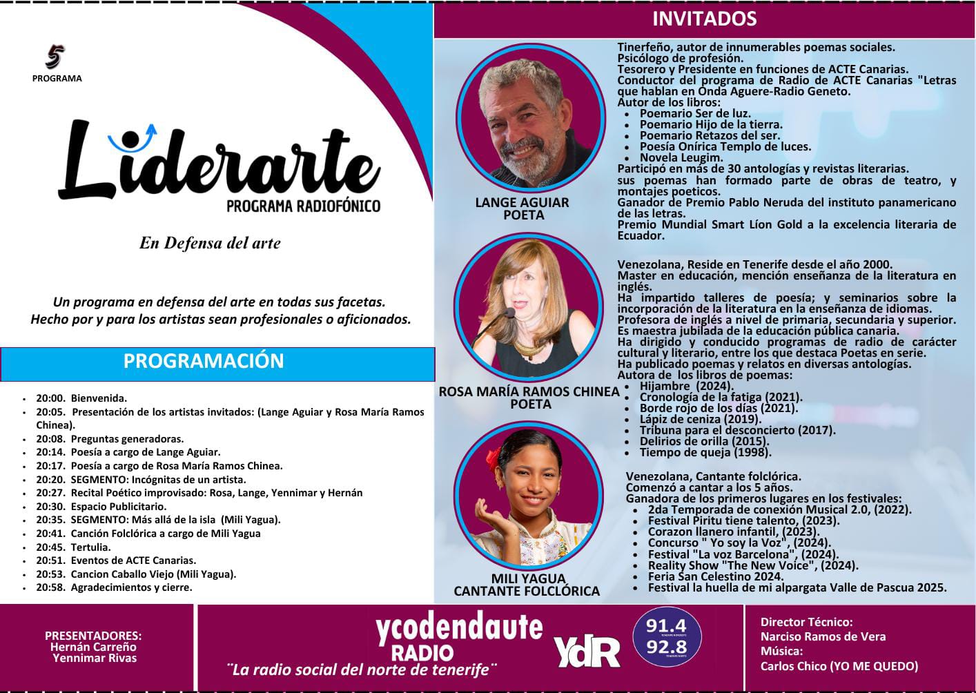 En nuestro segmento: "Palabras que trascienden" de vuestro programa radiofónico LIDERARTE, los poetas Lange Aguiar y Rosa María Ramos Chinea, junto a la cantante folclórica Mili Yagua, hicieron una excelente participación de la mano de Hernán Carreño y Yennimar Rivas.